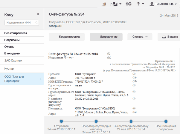 Получатель, после получения исправленного счета-фактуры, должен просмотреть информацию о документе, который, при этом, ничем не будет отличаться от печатной формы исходного счета-фактуры, за исключением заголовка и внесенных изменений. |